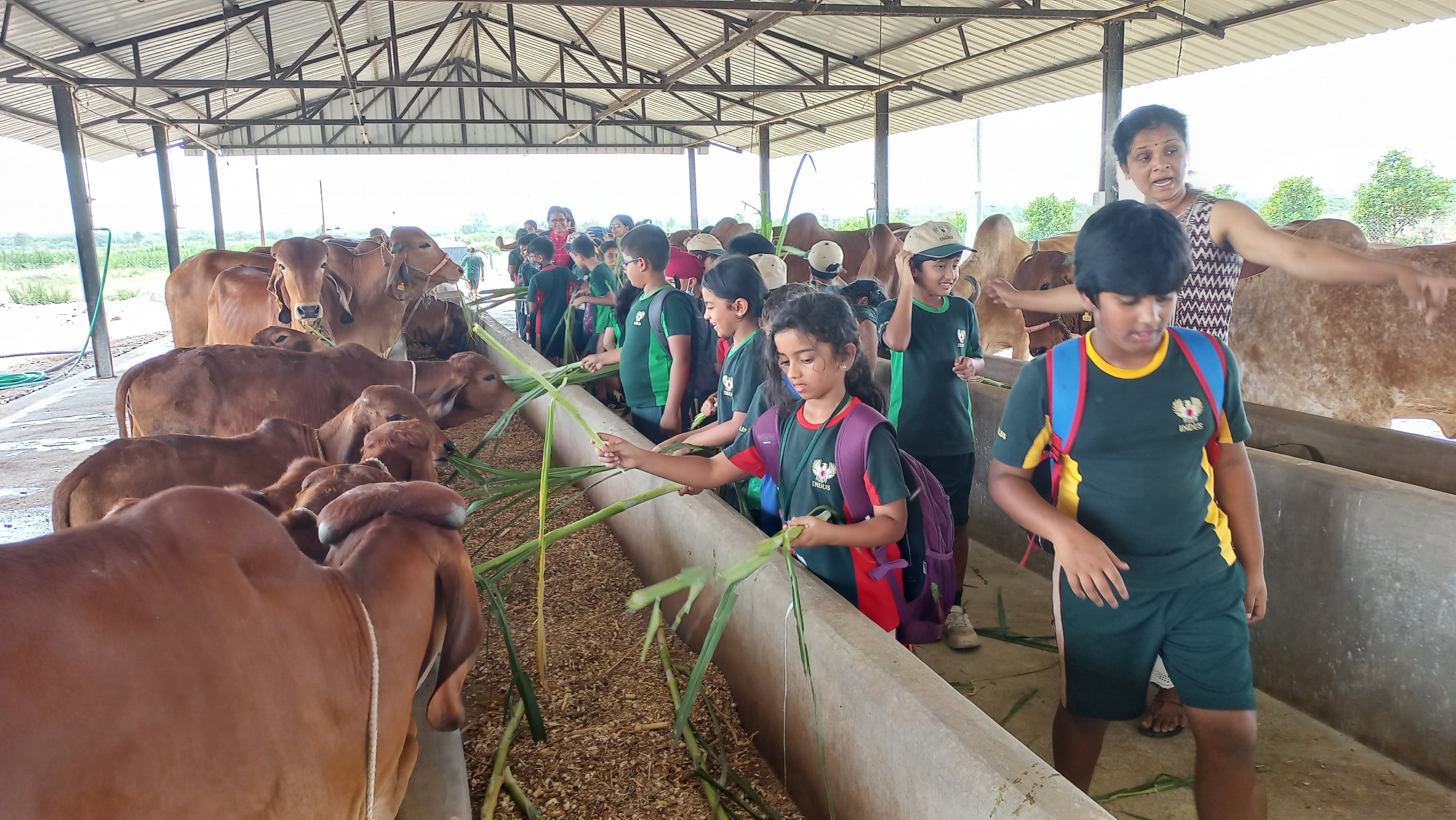 To feed the cows, many kids brought hay from the farm. They were delighted to serve them once they arrived at the cow shed area. They relished the absolutely novel and exceptional experience of feeding Indian cows beneath the shed.